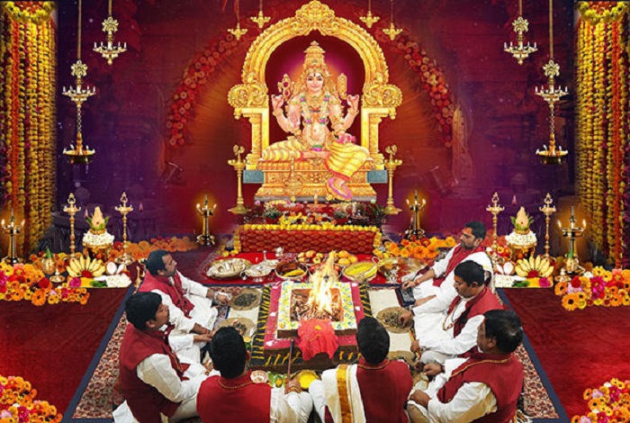 Preparation of Hawan Kund: A hawan kund (fire pit) is prepared, and the sacred fire is kindled. Offerings such as ghee, grains, herbs, and other auspicious substances are offered into the fire while chanting specific mantras dedicated to Goddess Baglamukhi.